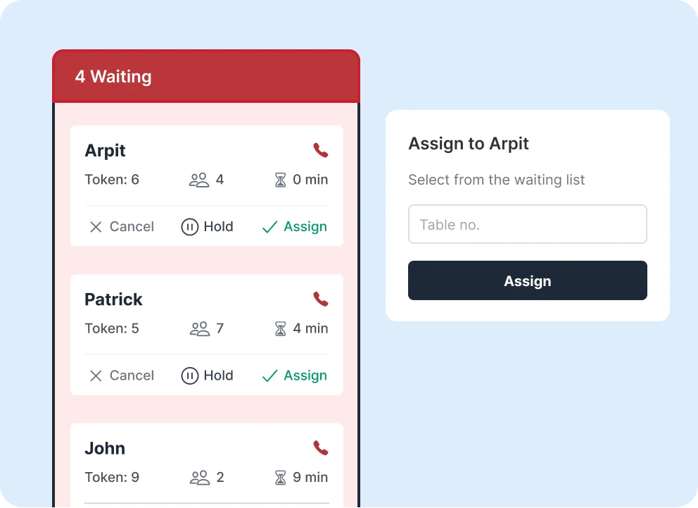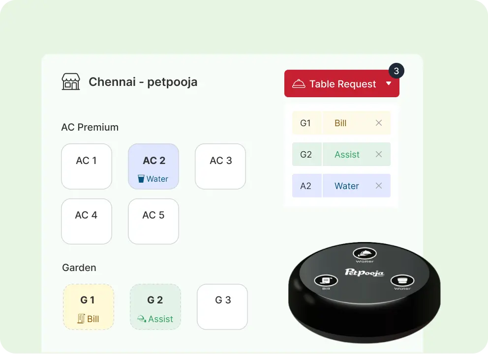 A small and stylish device with different LED colours kept on the table, allowing customers to call for the waiter, ask for water or request a bill, at the click of a button